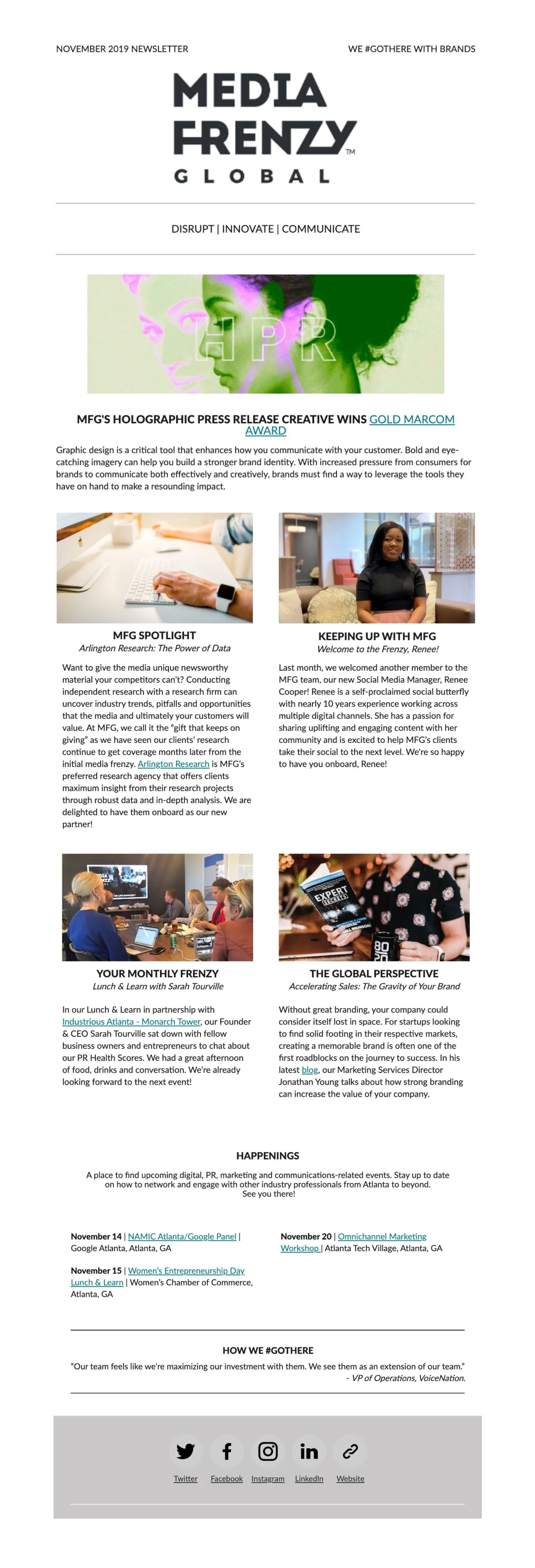 While working at my last agency, I was responsible for creating monthly newsletters highlighting recent events, company wins, thought leadership, etc. From writing copy to email distribution, I was involved in the process from start to finish.